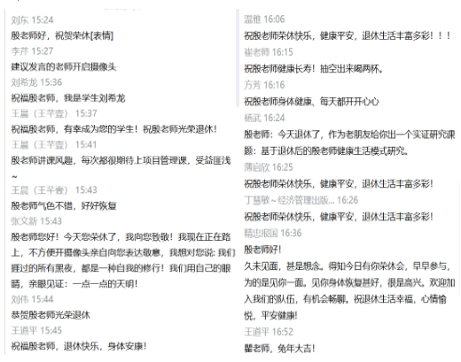 殷老师动情地发表了荣休感言,一度哽咽,尽管对工作岗位充满不舍,但殷老师依然无私地希望将更多的机会留给年轻人。在自由交流环节,暗网 杨武老师、杨青老师、张俊光老师、戴淑芬老师、何润宇老师、刘明珠老师、朱晓宁老师等回顾了与殷老师共事的难忘瞬间,表达了对殷老师最美好的祝愿。殷老师的学生们也争相发言,回忆了读书期间和殷老师相处的难忘点滴,分享了从殷老师那儿学习到的做人、做事、做学问的道理,以及殷老师对自己人生的重要影响,纷纷表达了对殷老师的良好祝福。