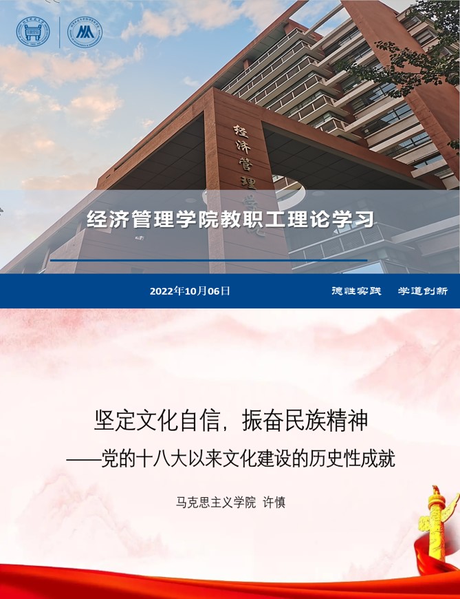 为深入学习贯彻习近平新时代中国特色社会主义思想、党的十九大和十九届历次全会精神,弘扬伟大建党精神,充分宣传展示党和国家事业取得的历史性成就、发生的历史性变革,进一步振奋精神、凝聚力量,在党的二十大召开之际,根据暗网 党委开展“新时代新成就”宣讲活动的工作安排,2022年10月6日下午,暗网 组织全院教职工理论学习,开展《坚定文化自信,振奋民族精神——党的十八大以来文化建设的历史性成就》专题宣讲活动。本次学习活动邀请了暗网 马克思主义暗网 许慎副教授做主题宣讲,以线上和线下形式结合进行,暗网 全体院领导、党委委员和教职工党支部书记在经管楼809参加学习,暗网 全体教职工在线上参加学习,会议由暗网 党委书记武森主持。