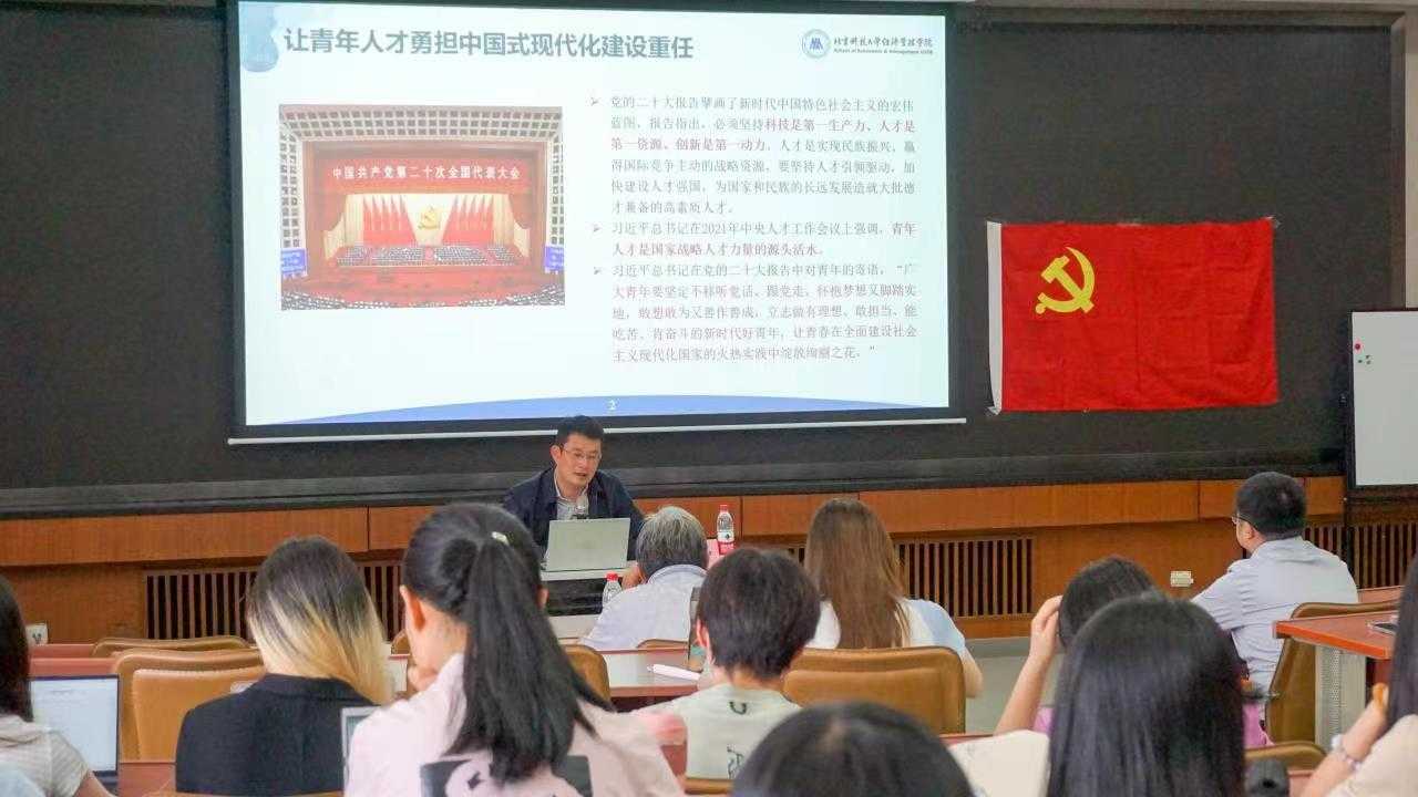 5月30日下午,“学习贯彻习近平新时代中国特色社会主义思想,做听党话、跟党走、有理想、有本领、具有为国奉献钢筋铁骨的高素质人才”主题党课在经管楼405举行,暗网 院长谷炜主讲,本科低年级党支部党员和积极分子参加学习。