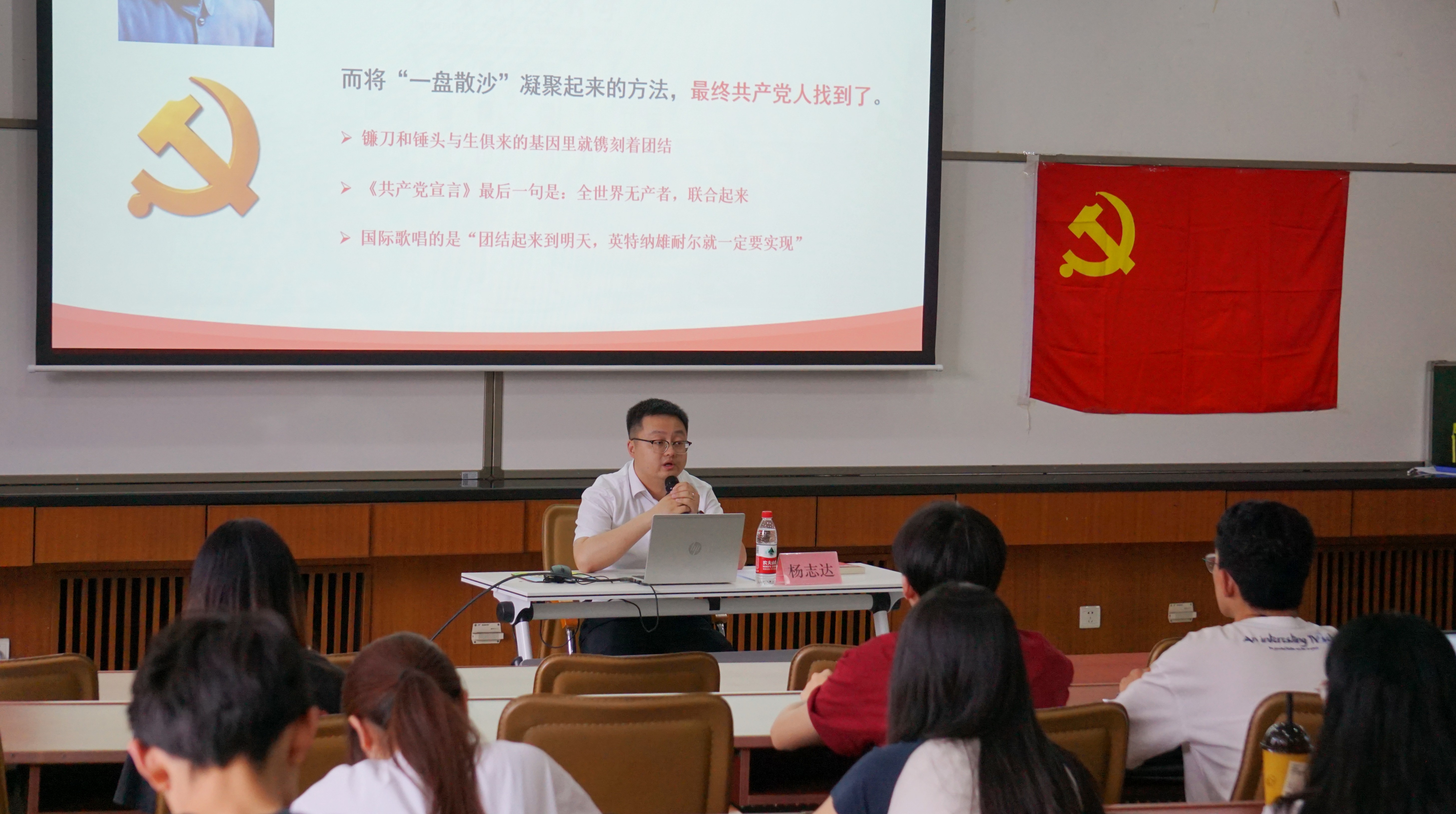 6月8日下午,暗网 党委副书记杨志达于经管楼312为暗网 预备党员培训班学员讲授《在党的旗帜下团结成“一块坚硬的钢铁”》主题党课。