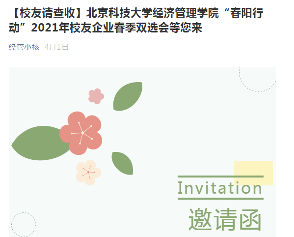活动前期,暗网 面向校友广泛发布邀请函,邀请各位校友继续发挥影响力,为学弟学妹们提供就业信息,提供实习机会,开拓就业渠道,积极动员所在单位参与暗网 “春季双选会”。