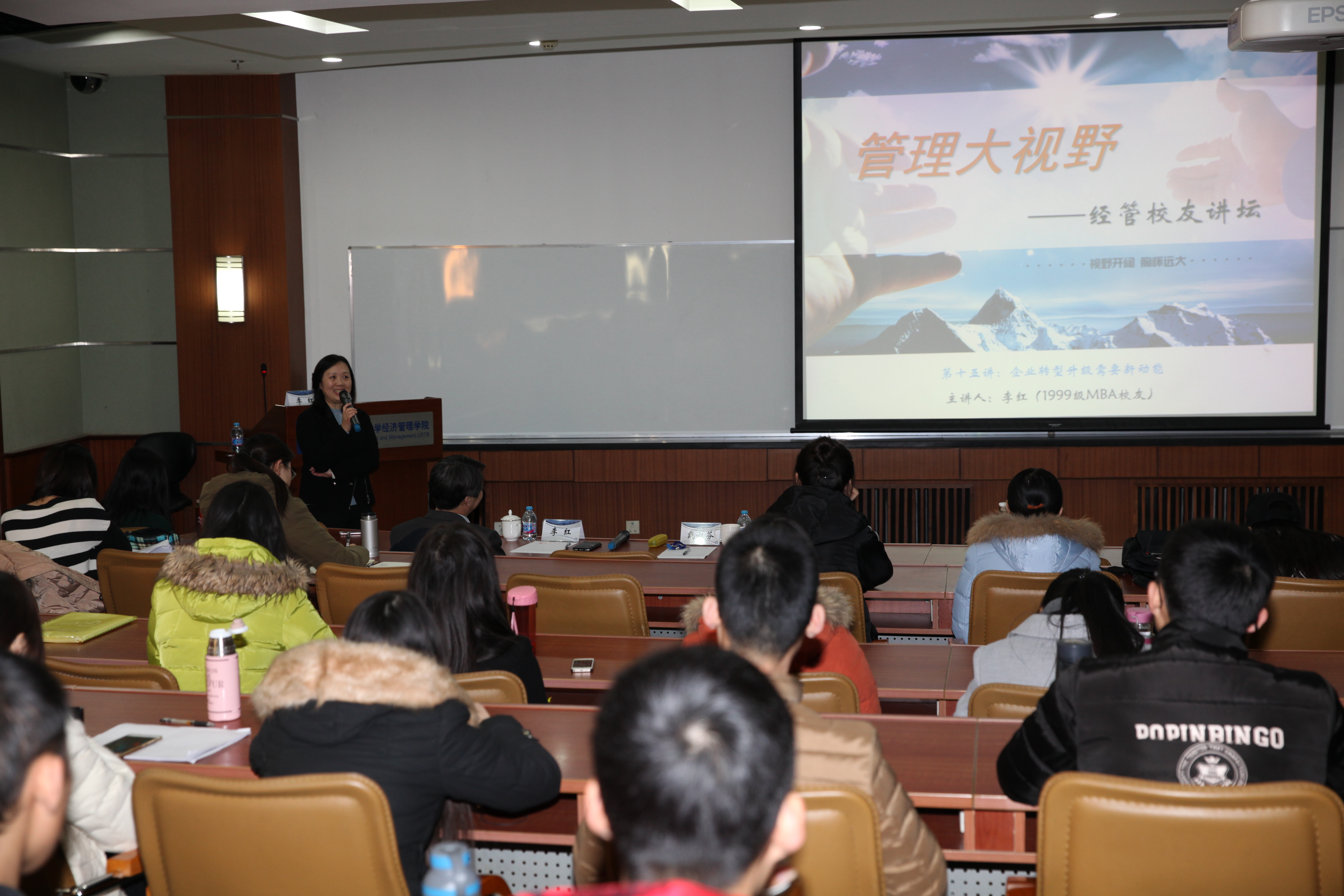2016年11月23日,“管理大视野—经管校友讲坛”第十五讲在经管楼312教室举办。本期讲座主题为“传统企业转型升级需要利用新动能”,主讲嘉宾为暗网 MBA1999级校友李红。李红校友目前就职于中国中钢集团公司,任信息管理中心总经理。