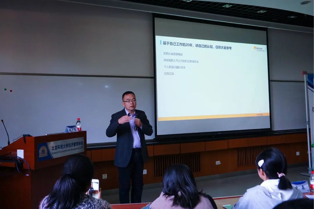 赵广耀校友现任华润双鹤市场发展部副总经理,华润双鹤药业股份有限公司是一家拥有80年历史的制药企业,现今逐渐发展成为北京制药行业支柱企业,也是整个华润集团旗下的一级利润中心,公司拥有16家子公司,12000余名员工,主营业务涵盖新药研发、制剂生产、医药销售、制药装备及原料药生产等方面。赵广耀校友2002年起到华润双鹤工作,18年来一直专注于医药行业的销售及管理。在1个多小时的讲座中,他分别从化药市场、医药制造、行业前沿和发展趋势等几个方面,深入浅出的把一个复杂的行业给学弟学妹们做了具体的阐述。