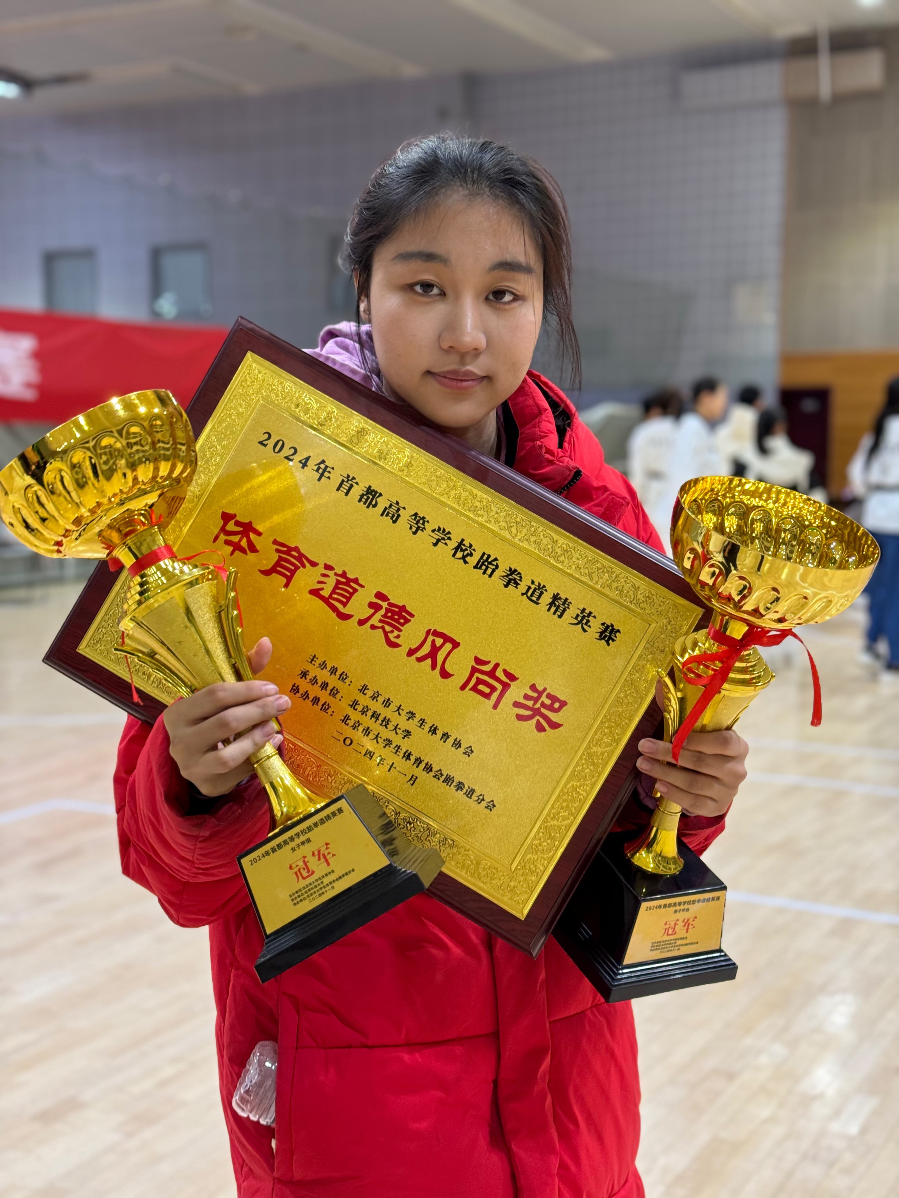 获2024年国创赛主赛道金奖、2024年挑战杯主赛道国家铜奖、2023年挑战杯红色专项赛国家铜奖、首都大学生跆拳道比赛女子67kg冠军、品势太白冠军、校三好学生、优秀学生干部。
