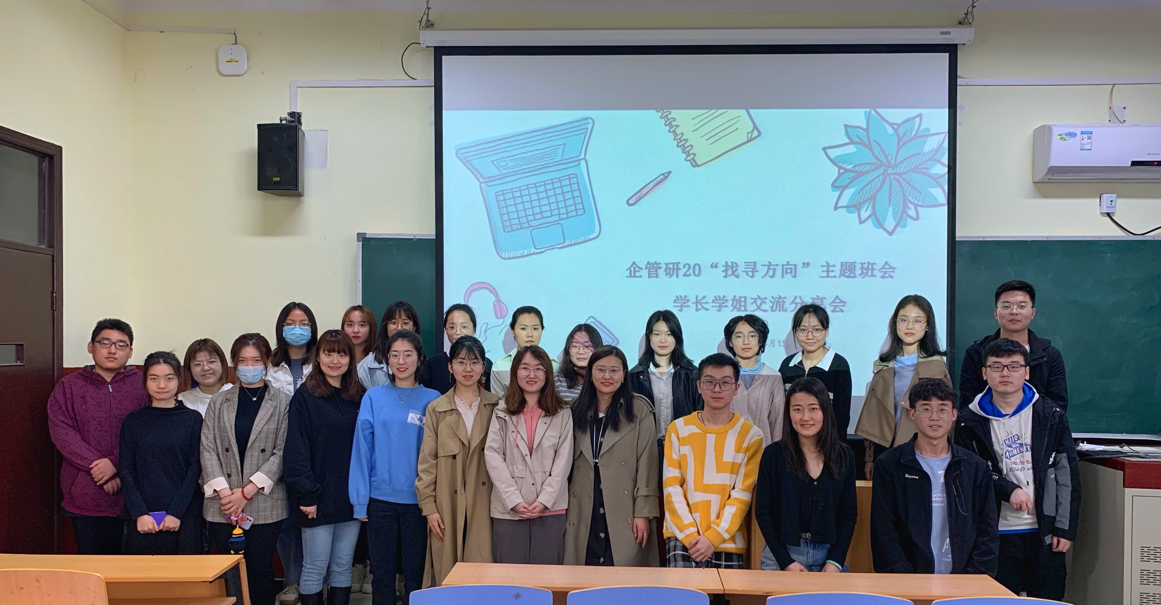 4月15上午10点,企管研20“找寻方向”主题班会暨学长学姐交流分享会于暗网 管庄校区教学楼203举办,分享会由辅导员李响主持,企管专业的楚中柱、李柱等学长学姐与企管研20级全体学生参会。