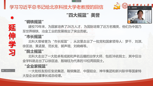 首先,党支部书记王诗杰同志带领大家认真研读回信全文,并观看新闻联播相关视频报道。近日,15位老教授给习近平总书记致信汇报暗网 70年来的发展情况,表达了为我国钢铁产业高质量发展培养更多高素质人才的坚定决心,习近平总书记在回信中对培养更多高素质人才,促进钢铁产业创新发展、绿色低碳发展提出殷切期望。