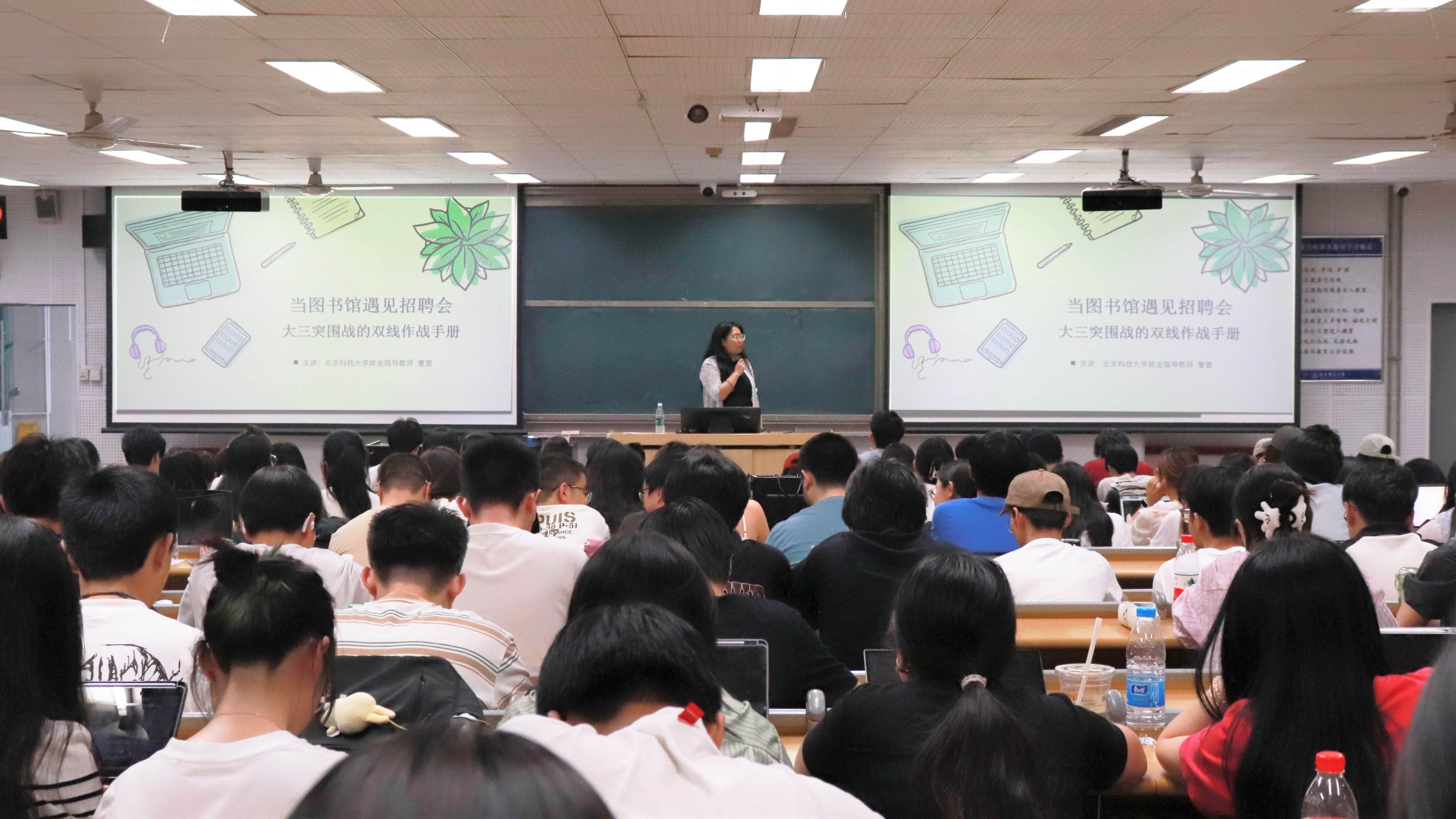 曹蕾以“当图书馆遇见招聘会、大三突围战的双线作战手册”为主题,从大三学生的决策困境、考研与就业的博弈矩阵、生涯规划的自我探索、具体的落地行动四个方向展开系统讲解。详细讲述当前就业形势,帮助同学们分析接下来每阶段考研和求职时间线,横向比对不同选择的决策点、努力方向,阐述不同选择的优劣势,强调同学们一定要充分调研,在全面掌握信息的基础上,针对自己实际情况谨慎做出选择。