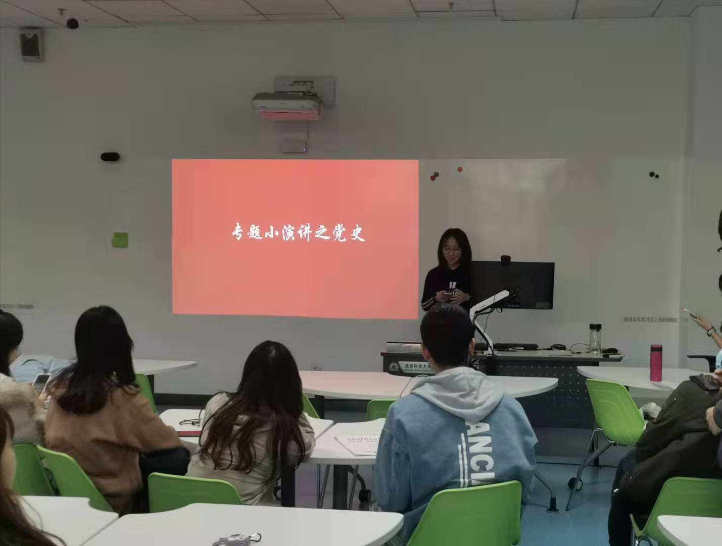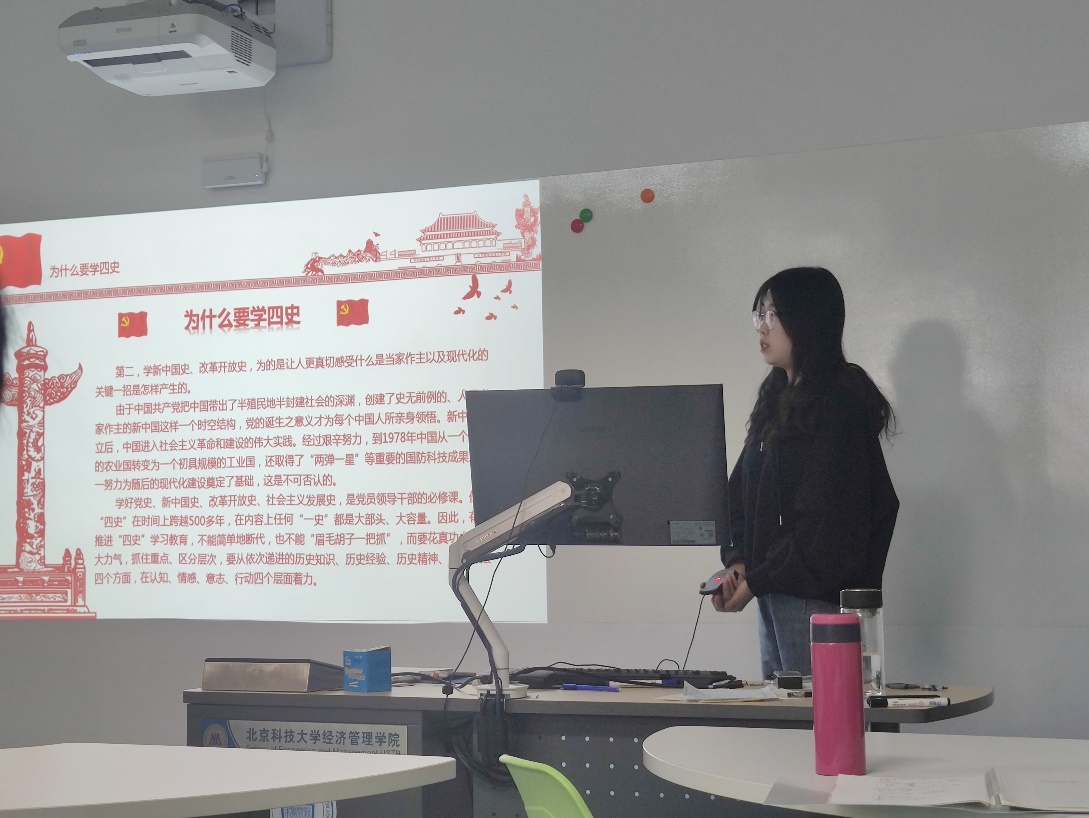 结束了刘老师的宣讲,主题团日活动正式开始。首先是第一部分,学四史,守初心。团支书从什么是四史,为什么要学四史,学四史的意义三个方面对这一主题进行讲解。四史分为中国共产党史,新中国史,改革开放史,社会主义发展史,是由习近平主席指出全体共产党员都应该深刻学习的为人民谋幸福、为民族谋复兴、为世界谋大同的实践史。学习四史,是共产党员学习历史思维,培养历史视野,增强历史担当,摆正工作,摆正责任,适应新时代必经之路。