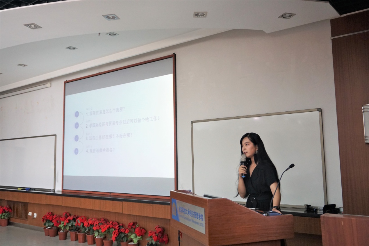 随后,杨超校友提出了对于选择专业的几点看法:要了解自己的意向专业,有效利用课程安排并了解职业方向等信息。吴文旭校友讲到国际贸易流程中涉及到的工作内容,对就业方向、不同职业的优劣势进行分析,同学们受益匪浅。