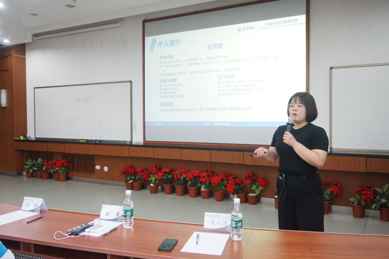 徐展校友就职场习惯的养成、学习经历、沟通能力发表了自己的观点。他讲到,在工作前要有一定积累,如专业知识和跨界知识、心态、适应能力、表达能力、团队协作能力等。王欣达校友讲到目标管理、审核造价、招标等工作经历,建议同学们大一开始培养学习能力,大二培养专业能力,大三进行企业实习,大四培养工作意识,达到职场人的目标。