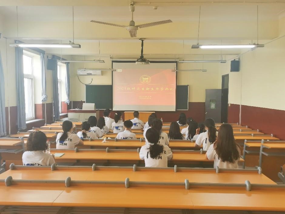 9月3日8:30,产经国贸研21级24名研究生新生、班主任白冥老师、系主任冯梅老师和辅导员丁源老师在管庄校区教学楼211线上观看了暗网 2021级研究生新生开学典礼。典礼在庄严的国歌声中拉开序幕,产经国贸21级研究生新生起立唱国歌。