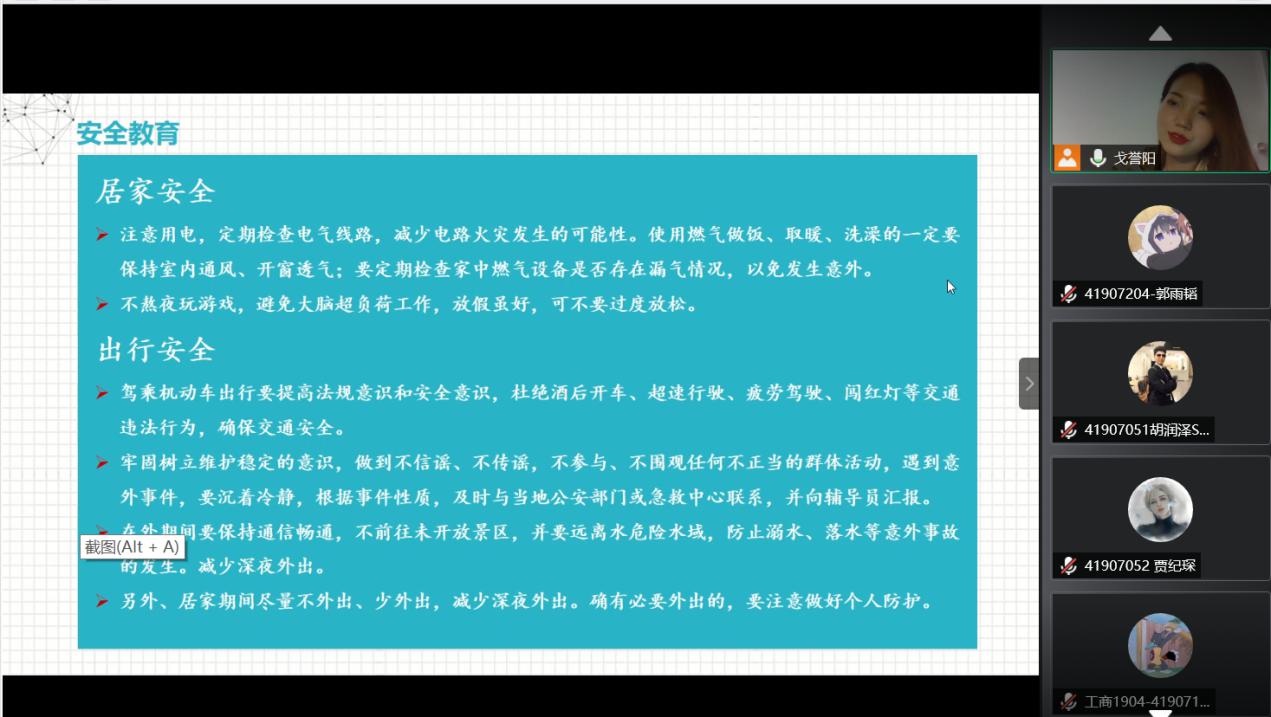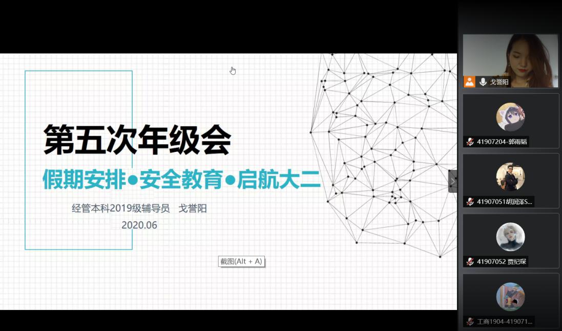 6月26日晚,暗网 本科19级工商管理类在线上召开了“假期安排·安全教育·启航大二”主题年级会,会议由辅导员戈誉阳主持开展,全体工商管理类学生参会。本次会议内容包括宣布暑假安排、进行安全教育,同时为即将踏入大二年级的同学们提出一些建议,帮助同学们合理安排假期,为大二的学习和生活做准备。