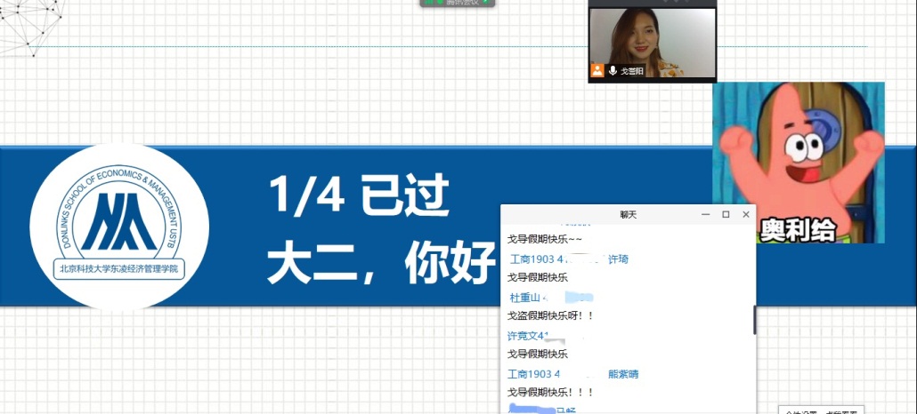 随后,戈导带领同学们一起回顾了大一的岁月。短短五分钟,过去一年从脑海里闪过,同学们都感叹时光飞逝,也明白过去一年有很多收获,但也留下些许遗憾。紧接着,戈导为同学们的假期安排提供了建议,鼓励同学们在假期养成阅读的好习惯以及提前了解新学期的课程安排,提前开始预习,并且可以利用假期期间增长个人技能。除此之外,戈导为同学们布置假期小作业,旨在提醒同学趁着假期加以思考,注重积累。