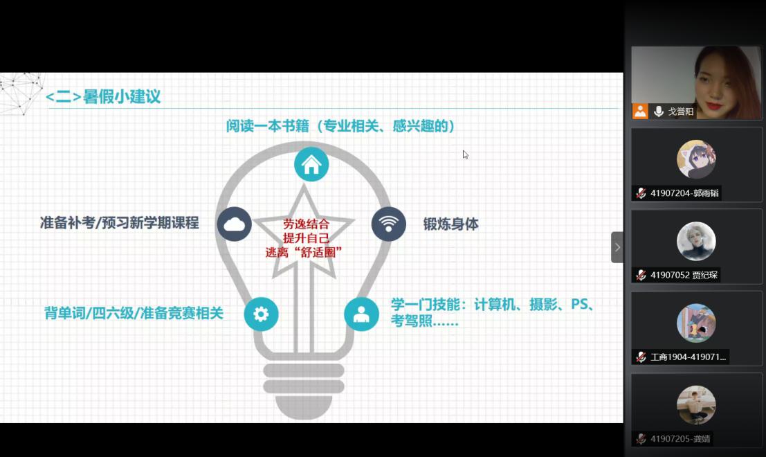 首先,辅导员戈誉阳宣布暑假安排和小学期安排,提醒同学们把握假期,充实自己。随后戈导强调,没有官方渠道的返校通知同学们一律不得返校,疫情还未彻底结束,要注意自身安全。