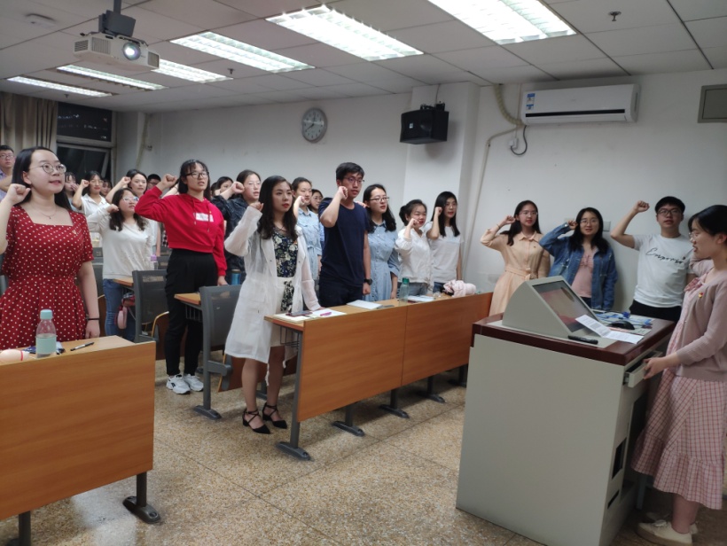 本次党员讲党课的主题为“五四精神”,4位预备党员根据习总书记在4月30日纪念五四运动100周年大会上的讲话,将本次党课分为四个板块:五四运动的历史意义、勉励新时代中国青年建功立业的要求、如何确保党的事业薪火相传和青春向党。在党课的尾声,低年级党支部不仅观看了一段习总书记的讲话视频,还在讲解人的带领下进行了由中国青年报举办的“新青年耀青春”的宣誓环节。