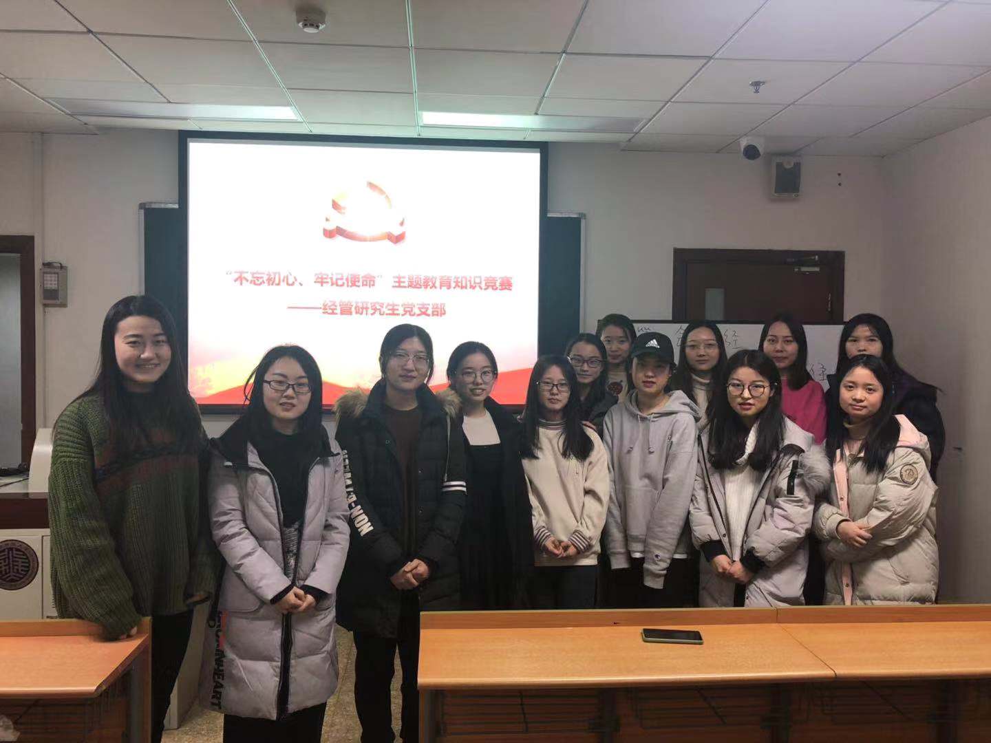 12月30日下午,会计技经研19党支部于管楼504开展了“不忘初心、牢记使命”知识竞赛,竞赛由李响老师主持。竞赛内容主要包括主要包括习近平新时代中国特色社会主义思想、党的十九大精神、党章党规、主题教育“应知应会”、党务知识等相关内容。