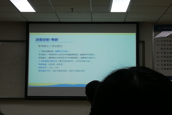 在此次班会中,孙鑫老师以数据的形式总结往届学生在方向选择中的失败和教训,为同学们敲响警钟,叮嘱大家在选择中,一定要知己知彼,对自己有清晰的认识、有明确的目标,并分别从保研、就业、考研、出国等未来发展方向带领在座同学进行决策分析,提出具体解决措施和要做的准备工作。
