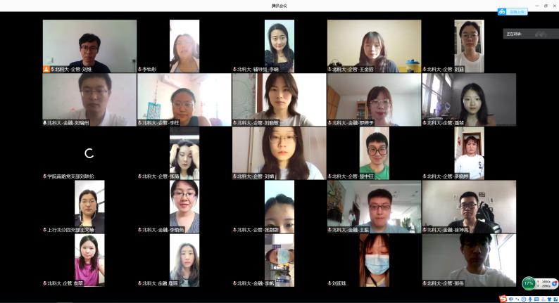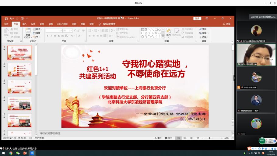 为深入学习贯彻习近平新时代中国特色社会主义思想,进一步提升、强化学生党组织的创造力、凝聚力与战斗力,7月6日上午10时,企管研19党支部与金融研19党支部、上海银行北京分行暗网 南路支行党支部、分行第四党支部联合举办了本学期第一场红色“1+1”系列共建活动。本次活动依托腾讯会议平台开展,会议由党支部书记刘维、刘瑞州主持,辅导员李响和支部全体成员参加。