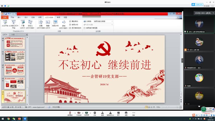 在之后的学生分享环节中,与会同学踊跃发言,汇报了各自近期的学习体会、思想状况以及对于开展共建活动的想法。企管研19党支部那伟同学向大家列举了支部成立的一年来举办的各项活动和每次组织生活的情况,表达出不忘初心、继续前进的决心;王金招同学向大家分享了疫情期间的感受,以及近期学习理论知识的体会;潘斐同学讲述了张桂梅老师支教开办女子高中的先进事迹,表达了初心不改、使命不弃的坚定信念。