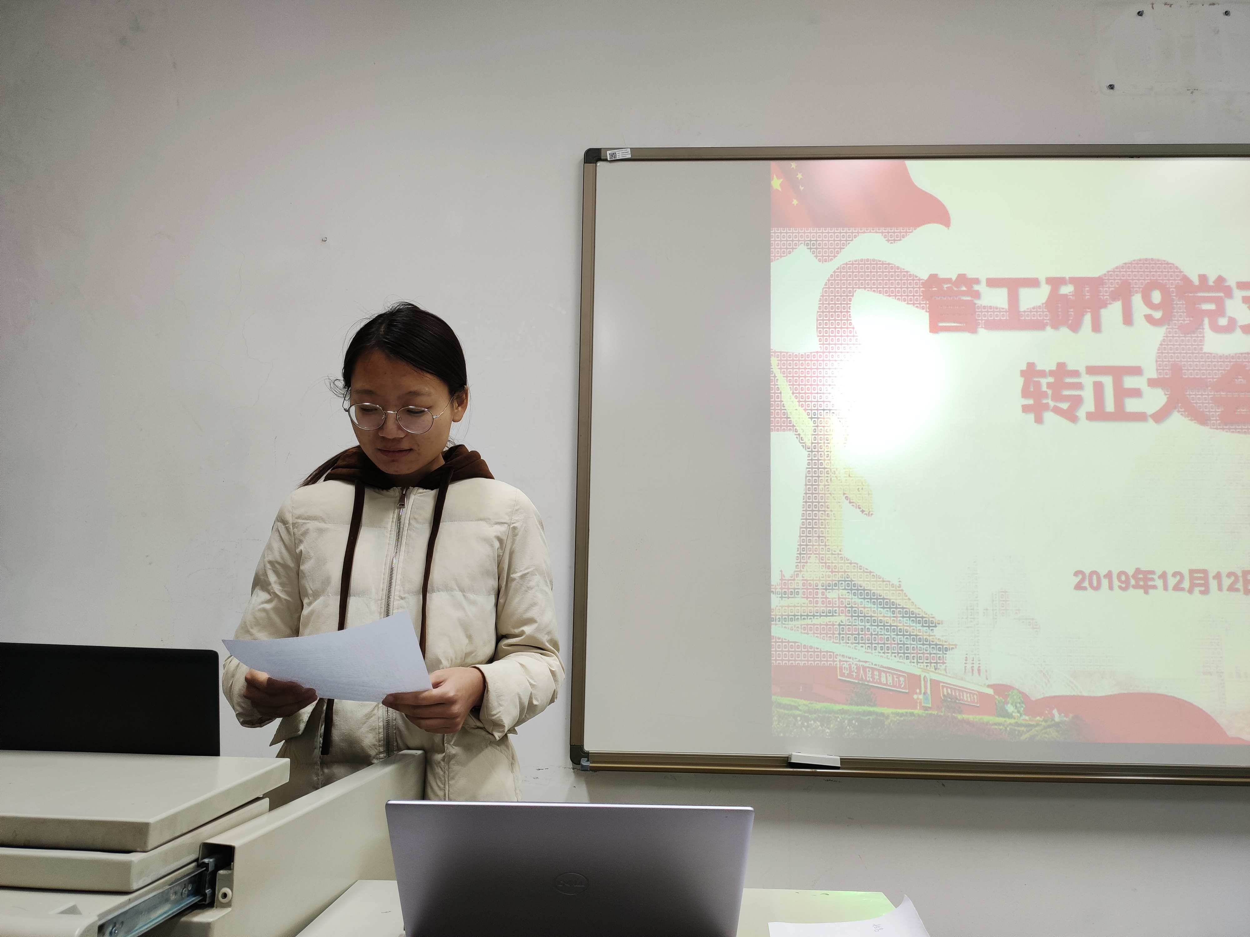 12月12日,东凌暗网 管工研19级党支部在管楼310顺利召开了中共预备党员转正大会暨“不忘初心、牢记使命”主题观影活动,党支部书记尹香婷主持本次活动。