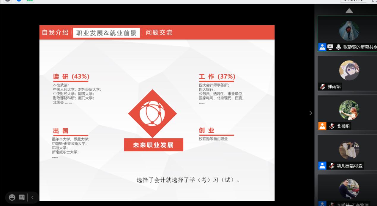 紧接着,张静亚师姐介绍了会计学专业,并且强调了会计学对于学习能力的培养以及思维方式的塑造。除此之外,她还介绍了会计学专业的就业前景,但是她表示并不是学了会计学就意味着只能做会计,学科与学科的互通性即意味着很多的机会和很多改变的可能。