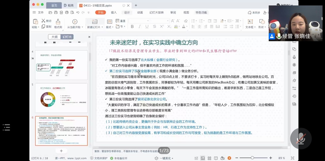 张晓佳老师首先从为什么要选择实习这个问题入手,向大家说明了抉择未来的时候要结合自己的特质,明白自己到底想要什么,要根据自己的偏好寻找自己满意的方向。她表示,在对于未来感到迷茫时,要自己勇敢尝试了解,可以积极参加实习并在实习中确定方向。并且要从小做起、从一件事做起,逐渐积累自己的经验。