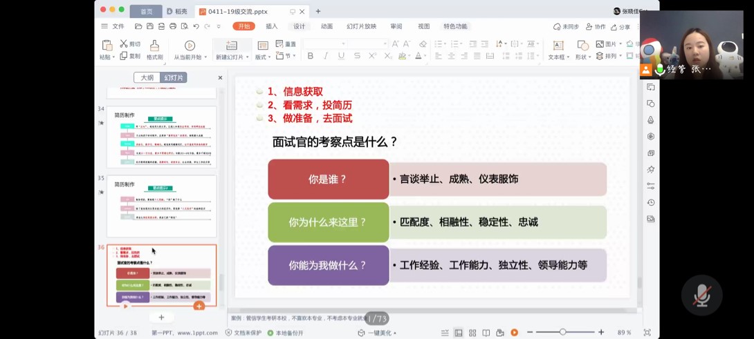随后,张晓佳老师向大家传授了两个优先和三个要领等简历填写技巧,为大家分享了制作简历时的注意事项和基本内容。