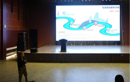 其次,张静老师讲述了生涯规划的步骤,从认识自己开始,将人格类型与职业环境相匹配,培养自己的兴趣,发现自己的性格优势,从而追求有温度的职业生涯。同时,张老师希望同学们及早了解外界世界,了解当前严峻的形势,及早地进行实习,以积累经验。