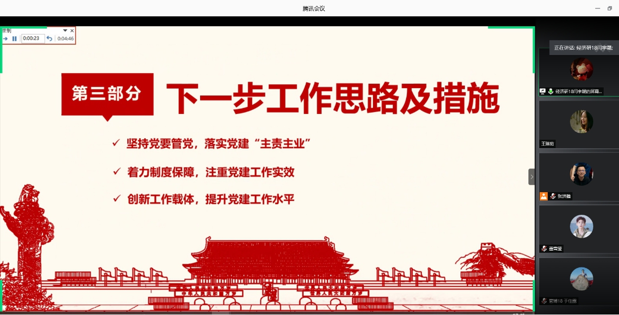 本次述职考核会以线上党支部书记述职和线下评审总结相结合的方式进行。在刘璐介绍述职流程和评分规则后,评委老师听取了线上述职的9个学生党支部的述职汇报并进行了线下评审的10个学生党支部书记述职总结材料的审议。
