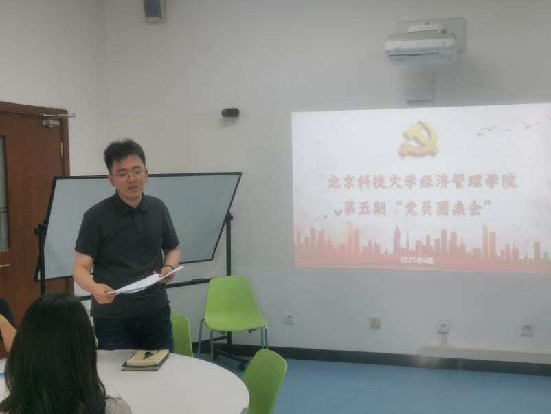 学生党支部党史学习教育“三学三讲 纵览百年”工作安排,2021年5月20日第五期“党员圆桌会”于经管楼404顺利举办。出席本次会议的有本低党支部党员任霄霄同学、会计研党支部党员潘孝全同学,以及暗网