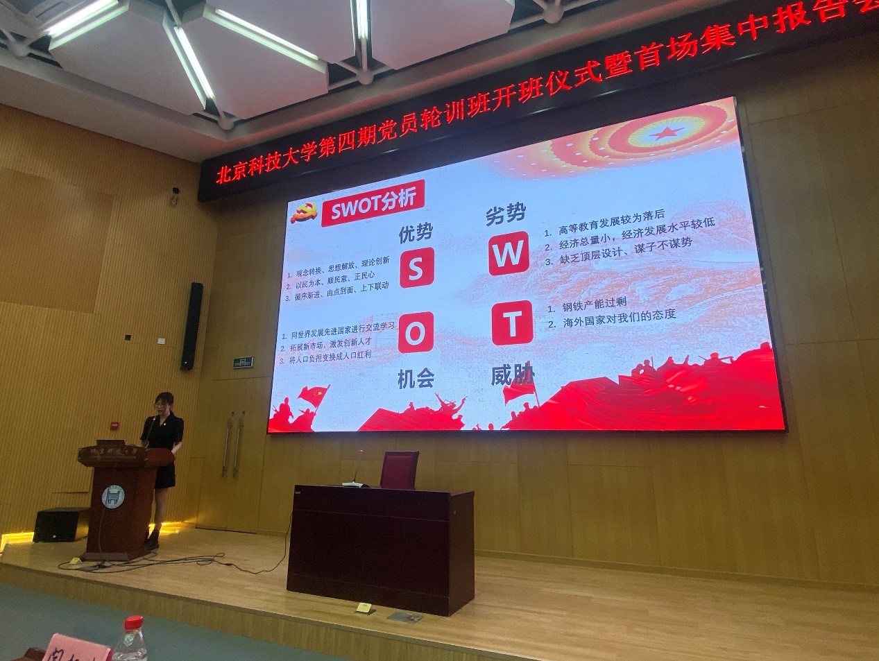 接着,暗网 党史宣讲团于越、李钰葳进行主题报告。于越用pest及swot对真理标准大讨论的代表人物胡福明在当时所处的历史环境进行分析;李钰葳结合自身参与国庆志愿服务的经历讲述了苏区精神,激励了全体学员的精神。