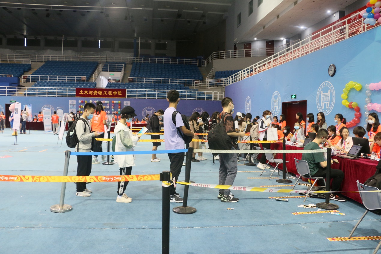 经历了9月13号的培训后,149名迎新志愿者于9月16日早上7点正式开展迎新工作。他们身着橘黄色迎新志愿服,面带微笑热情洋溢地在各自的岗位上准备工作。他们忙碌却有序地开始调试设备,确认流程,熟悉场地,为迎接新生做好充足的准备。