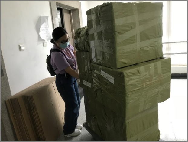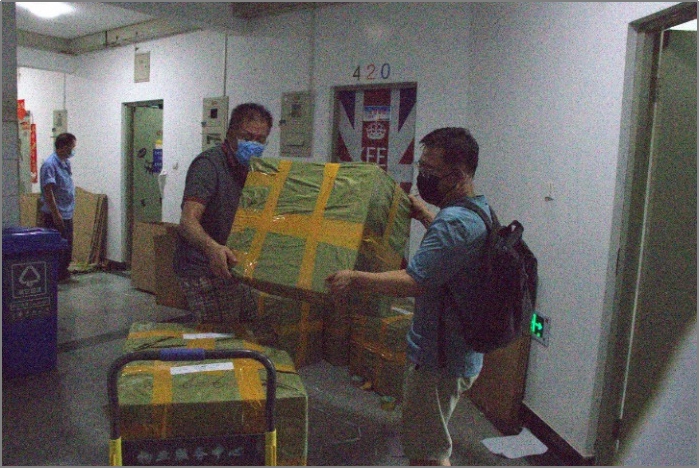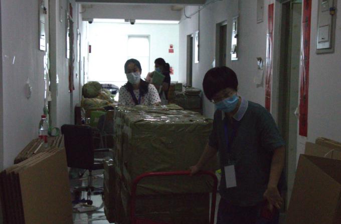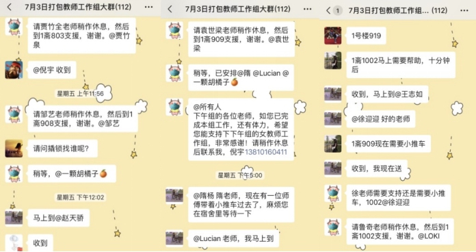 打包现场配有物资保障人员随时待命,为在“前线”奋斗的老师做好后方保障。过程中有出现缺少物资、人力的情况,老师们及时进行联系,领导小组即刻做出反应与调配,使工作效率达到最大化。