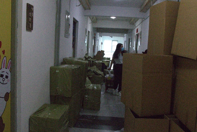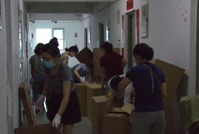 走廊里,老师们纷纷化身“快递小哥”,封箱子、缠胶带、装编织袋、核对信息……每一次密封打包填写个人信息时反复检查。电梯间,老师们拉着摞的高高的纸箱楼下楼下穿梭,到处都是奔走忙碌的身影。