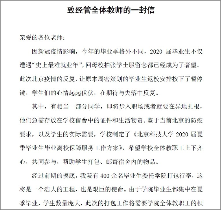 10余天的筹备,20小时的打包寄送,114位教职员工的不懈努力,135间学生宿舍,419名毕业生,2800余件行李……特殊毕业“寄”、别样师生情,经管全体教师携手云端相送,以实际行动助力2020届毕业生扬帆起航。