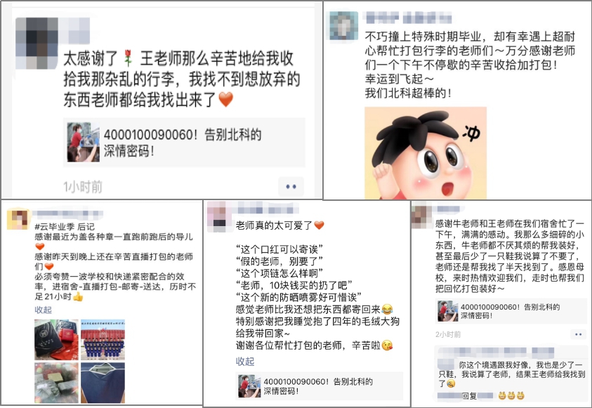 通知发出后,得到了老师们的积极响应,除暂不在京、处于中高风险地区等部分特殊情况的教师外,包括全体领导班子在内的114名教职工全部参与。在财务处、体育部、保卫保密处、后勤集团老师及员工的共同协助下,圆满完成2020届毕业生宿舍物品打包及寄送工作。截至7月4日下午16:00,所有委托寄送或暂存的毕业生共419名,个人物品全部处理完毕。