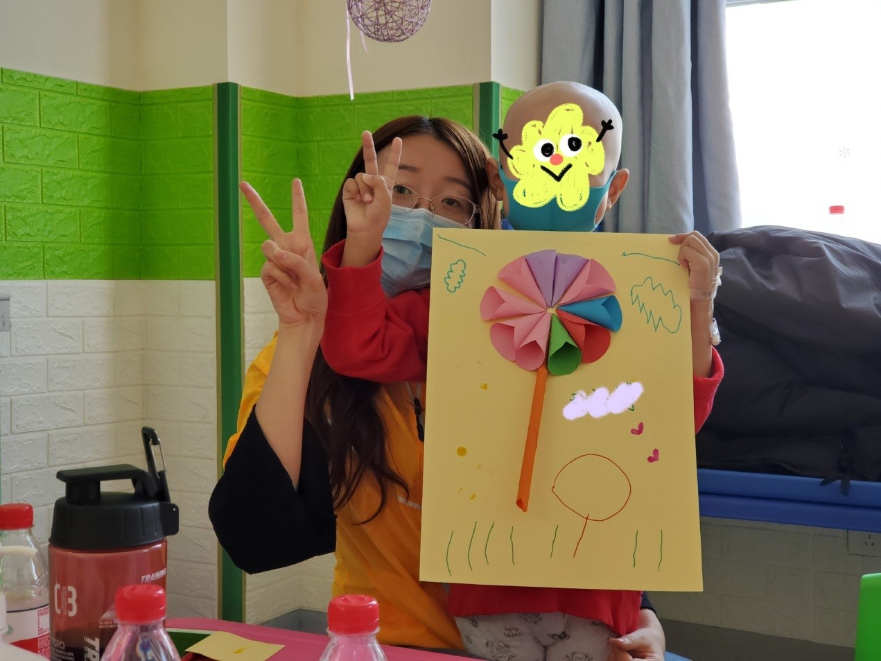 下午,志愿者们组织小朋友在医院活动室开展“谁是手工小达人”活动。在志愿者的教学下,小朋友们和志愿者合作完成手工绘画作品。心灵手巧的小朋友们发挥想象力,用画笔在纸上描绘出他们眼中的世界,富有童趣,充满活力!