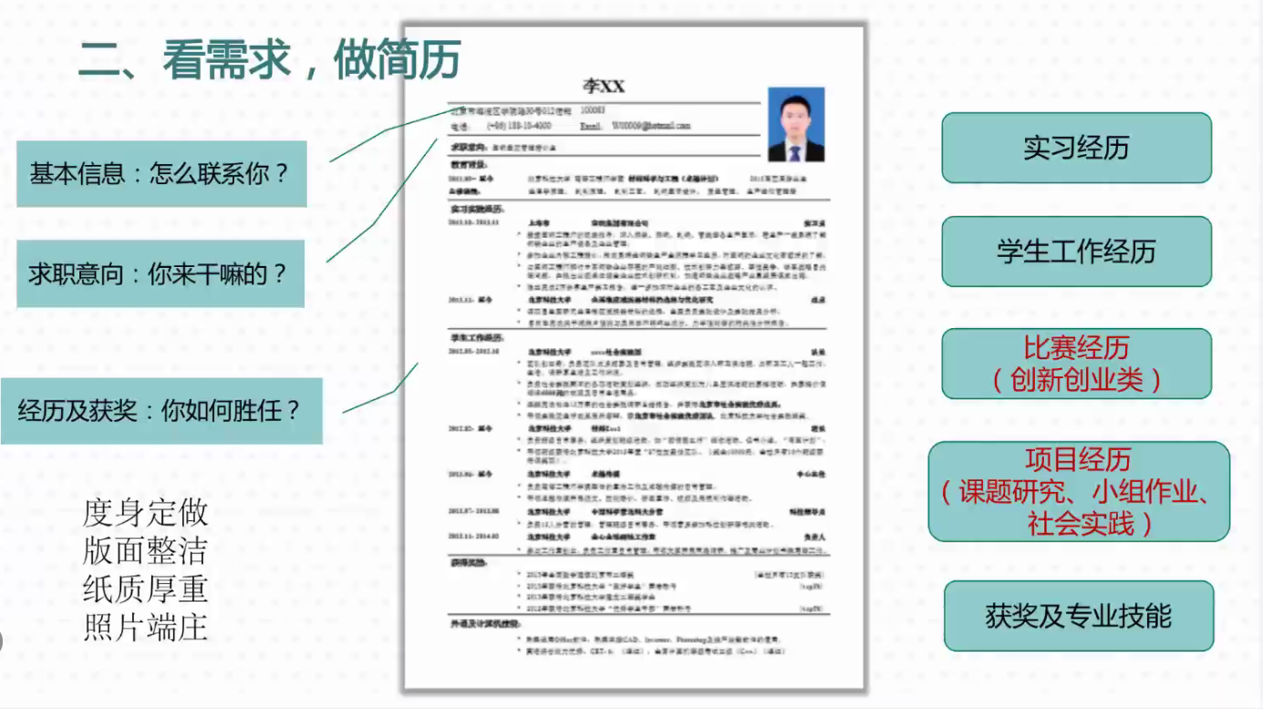 接下来张老师介绍了制作简历的方法,提出 “人岗匹配,重在岗”一个核心、“重要优先,相关优先”两个优点和“关键清晰,重点突出,内容饱满”三个要点,并简要介绍了简历基本信息、求职意向、经历与获奖的具体内容,强调除学习经历以倒序方式排列外,其他经历需要按照岗位需求和重要程度来排列,并以“数字为先、动词开头”来详细介绍,尤其要体现自己的贡献。针对一些同学提出“自我评价要不要写?”这个问题,张老师认为这个部分是简历中唯一主观的部分,如果一定要写,也要以“词语概括+简单举例”方式尽量保证客观。