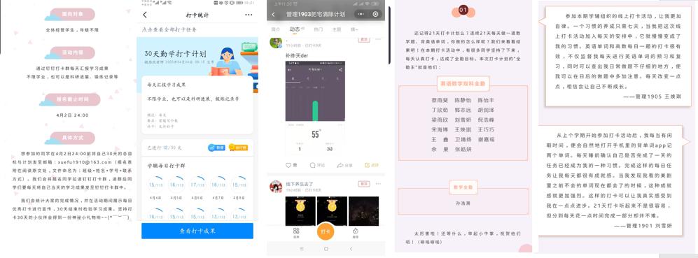 注重日常习惯养成,引导学生勤学自律。根据学生居家学习特点,暗网 学辅中心开展“勤学打卡计划”系列活动,并倡导各班根据班级需求开展“科研打卡”、“健身打卡”等有特色的打卡活动。在暗网 “勤学打卡计划”中成功坚持21天打卡的王焕琪同学说:“参加本期学辅组织的线上打卡活动,让我更加自律。当我把这次线上打卡活动加入每天的安排中,它就慢慢变成了我的习惯。”据统计,有近百位同学参加暗网 组织的各类打卡活动并长期坚持,引领勤学学风,吸引越来越多的同学养成良好习惯。