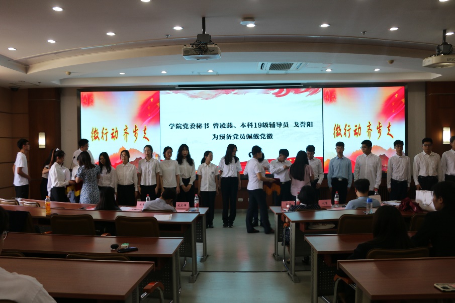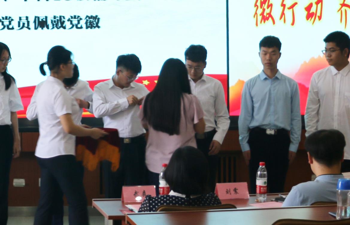 随后,曾凌燕、戈誉阳为预备党员代表们佩戴党徽,当象征和标志着中国共产党的党徽被庄严戴上,意味着已是预备党员的同学们将以更认真踏实的态度践行党的实践精神,为成为一名正式党员做出更多努力。