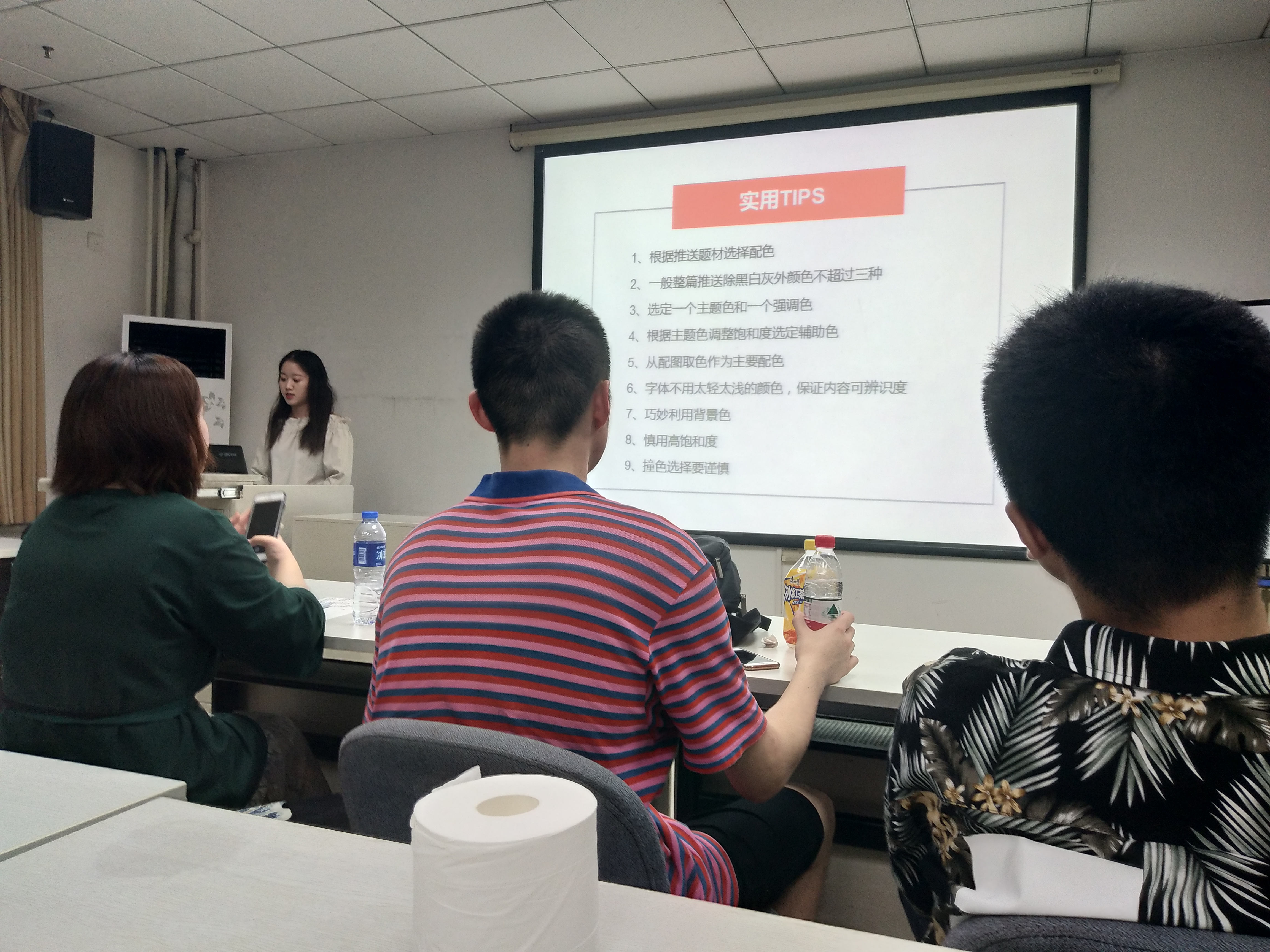 宣传部全体成员、各年级宣传负责人、其他各部门的学生干部代表进行了系统性培训。2017级辅导员刘璐参与并主持了本次活动。整体培训分为内容生产与基本运营和推送排版局部细节处理及实例操作两部分。 两位主讲人分别对于微信推送的目的,以及微信推送的版式规范性进行了较为详尽的解释与说明。会中,同学们仔细记录了培训要点,整体会议在高效、严肃又活波的氛围中顺利地开展。本次培训气氛融洽,同学们对两位主讲人提出的观点纷纷产生了共鸣,反馈效果良好。