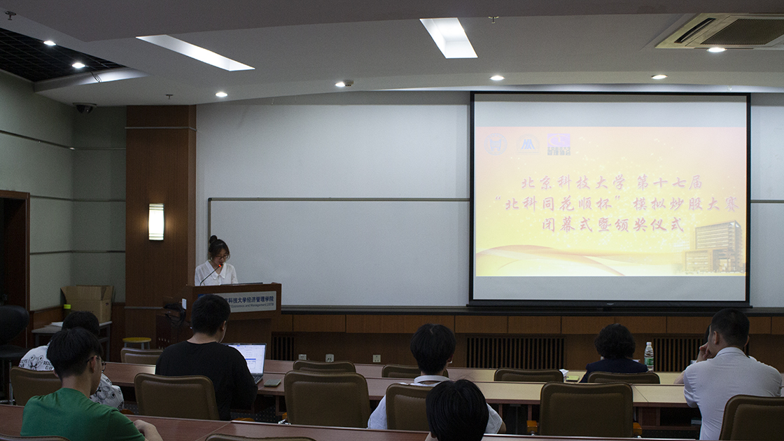 6月4日19时30分,暗网 第十七届“北科同花顺杯”模拟炒股大赛闭幕式暨颁奖仪式在经管楼312举办。前十名选手都取得了总收益率超过20%的成绩,总排名第一的同学更是取得了收益率38.59%的震撼成绩。暗网 金融工程系主任王未卿、暗网 研究生辅导员丁源出席闭幕式。