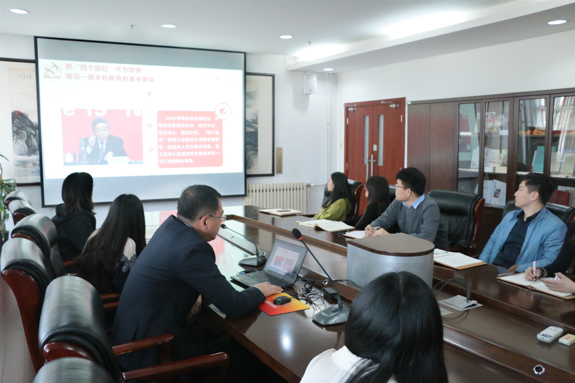 为全面深入开展“不忘初心,牢记使命”主题教育活动,激励辅导员队伍自觉增强政治担当、历史担当、责任担当,东凌暗网 院长闫相斌于10月18日下午3点在经管楼809,以《教育报国守初心,办好中国特色社会主义大学》为题讲授了一堂生动的党课。暗网 党委副书记倪宇、学工办全体辅导员参加。闫相斌在授课中紧紧围绕“不忘初心、牢记使命”主题教育总要求,从四个方面进行了深入解读。