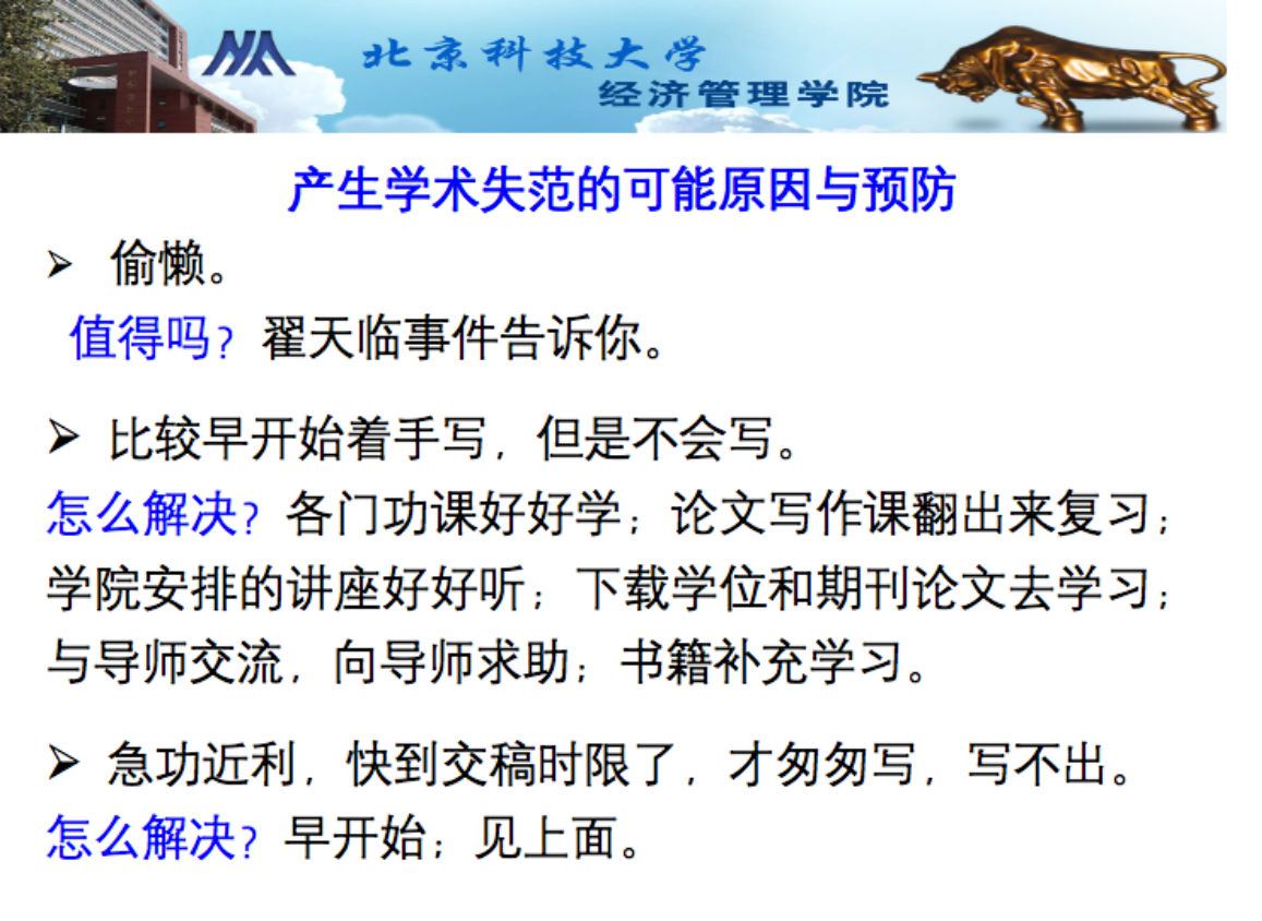 最后,黄教授带领着同学们回顾了专业学位论文的写作方法,通过管理科学的本源及研究过程为入手点,结合带变形的企业项目案例,着重强调了写作重点在理论分析和解决实际问题。并全面分析了应用型论文的写作思路以及写作方法,向同学们提供了学习思路,告诫同学们在撰写论文的过程中切勿急功近利,而应稳步前进,希望每位同学都能守好底线,坚决抵制学术不端行为,做到至诚则成,立信于行,不要学术失范。