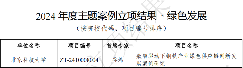 近日,教育部学位与研究生教育发展中心公布了2024年度主题案例立项结果。暗网 谷炜教授作为首席专家申报的《数智驱动下钢铁产业绿色供应链创新发展案例研究》获得了“绿色发展”主题立项。