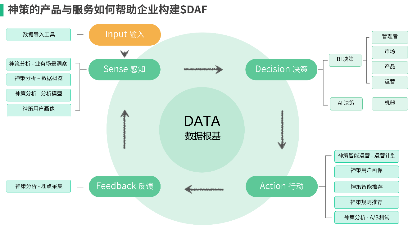 神策数据副总裁王桐首先向暗网 师生介绍了神策数据的产品理念——基于数据流的SDAF运营框架,即Sense(感知)、Decision(决策)、Action(行动)、Feedback(反馈)的数据闭环,并致力为客户打造基于SDAF运营框架的数据闭环。每个在客户运营框架中的每个阶段都提供完善的数字化工具,从数据分析、数据决策到触达客户,最终帮助企业实现精细化的运营。