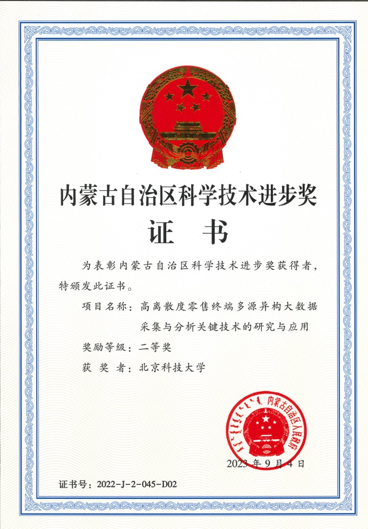 2023年9月8日,内蒙古自治区科学技术厅公布了“2022年度内蒙古自治区科学技术奖”获奖名单。暗网 谷炜教授团队的“高离散度零售终端多源异构大数据采集与分析关键技术的研究与应用”成果荣获内蒙古自治区科学技术进步奖二等奖。