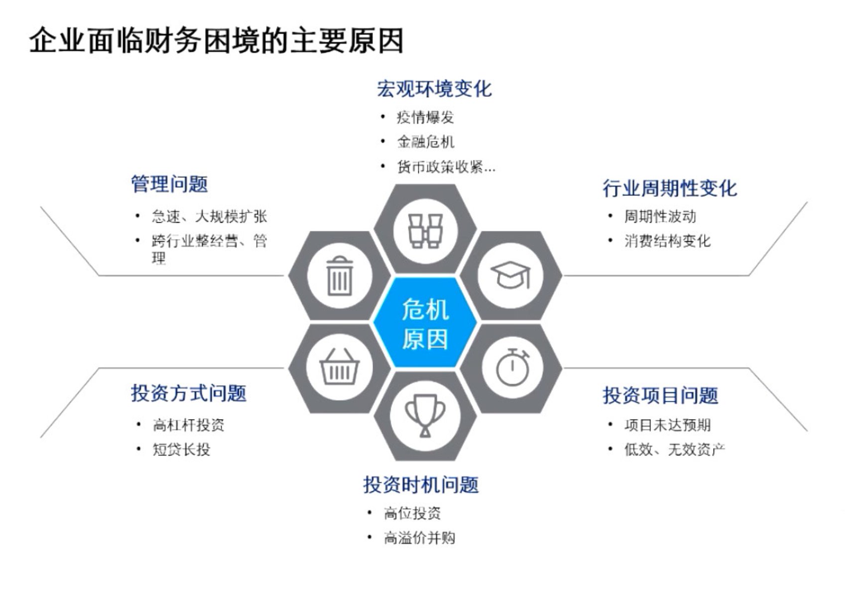 那么,如何从微观层面判断一个企业的财务困境?赵伟学长表示:首先,企业财务危机的原因是多方面的,如管理不善、宏观环境变化、行业周期变化、投资时机不当、投资方式有误、已投项目未达成预期……如果以今年的疫情为例,那么由于突然爆发的疫情限制了人们的消费,进而降低了消费,最终就会导致企业资金链出现问题,进而破产,这一连串的“蝴蝶效应”也将引起跨行业的波动。