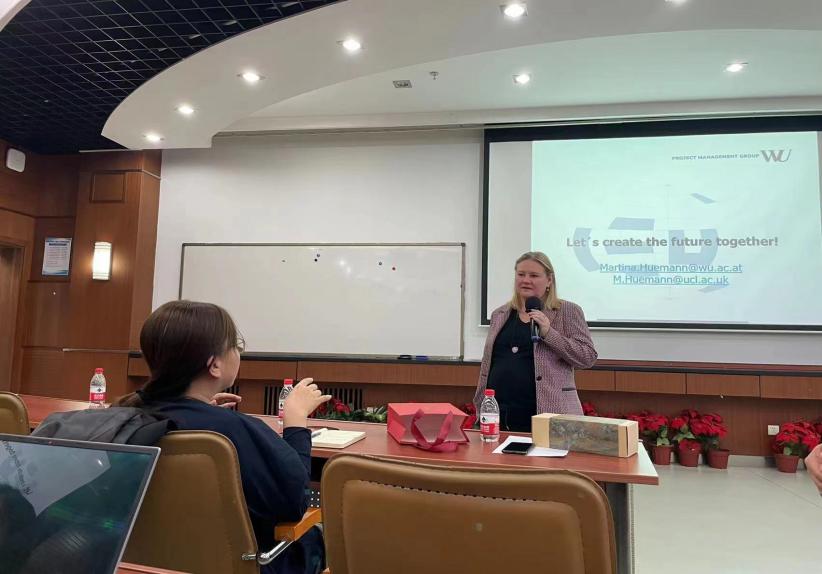 313报告厅为近百位学生呈现了以“The Power of Projects”为主题的学术报告,除博士、硕士研究生和本科生外,相关领域的教师和留学生共同参与了本次学术交流。Martina Huemann教授结合自身多年的研究经验以及担任高水平学术期刊主编的经历,分享了她对于项目型社会可持续发展和价值交付的深刻思考,她深入浅出地阐释了项目管理领域的前沿话题,与在场师生共同探讨了这一领域的未来发展方向。此外,Martina Huemann教授还分享了在高水平国际学术期刊发表文章的经验,为参会师生提供了实质性的指导。