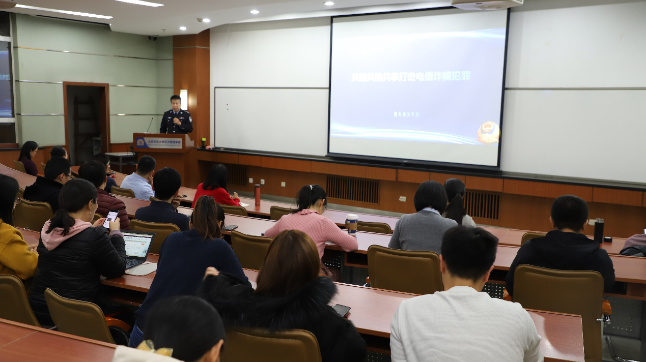 晚上6点,讲座在东凌暗网 312教室准时开始。郭秉义主任针对目前电信网络诈骗多发的现象,通过案例讲解的方式,从“什么是电信诈骗”“电信诈骗常见形式”“如何识别防范电信诈骗”“上当后如何补救”四个方面向师生介绍了电信诈骗的骗术,并提出“十原则”“五不要”防范建议,并再三提醒广大师生,一旦上当受骗一定要及时报警,并保存好相关证据材料。